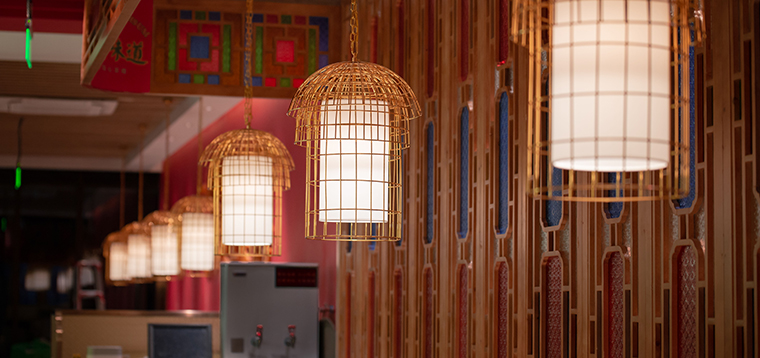 2、空間吊燈及照明裝飾設計。餐廳吊燈及照明裝飾是餐飲空間設計的重要部分,是空間陳設藝術的重要表現形式。不同的餐飲品類對燈具款式及材質都有特殊的要求。除了常規的玻璃、金屬、塑膠等工業材料外,還有一些自然的原生材料,如竹、藤、線、紙等。在品深餐飲全案策劃設計中,燈具的款式和材料都是統一在全案品牌策劃設計的系統中,比如我們服務的上海寶粵樓廣式點心茶樓,該空間的吊燈就是仿老廣州人提籠遛鳥喝早茶的情形,將鳥籠做成了吊燈造型,與品牌整體氛圍融為一體。