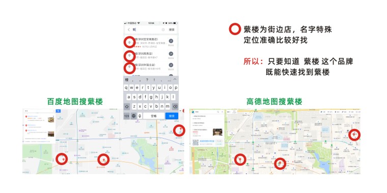 經過品深設計團隊研究洞察:“蘩樓”這個詞在搜索端屬于新詞,且由于都是臨街店鋪,只要在導航地圖上搜索“蘩樓”即可出現店面的準確地址,因此在海報地址信息中只需要告訴顧客店址區域即可,如:“華強北店”顧客自動腦補深圳華強北區域蘩樓,加上智能手機強大的導航功能,只需要搜索“蘩樓”選取“華強北”為主的關鍵詞即可知道離店的大概距離。