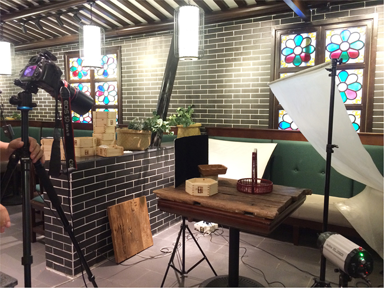 基于此我們制定詳細產品拍攝的方案,決定對產品的主桌面背景用老榆木來搭配,我們認為肌理感強,質樸悠久老榆木可承托出點心產品的手工技藝,也暗合品牌悠久的傳承歷史。產品其他背景搭配也選取購置了一些做舊的廣州人的生活器物來搭配,拍攝角度上根據產品特色及海報表現多角度展開。