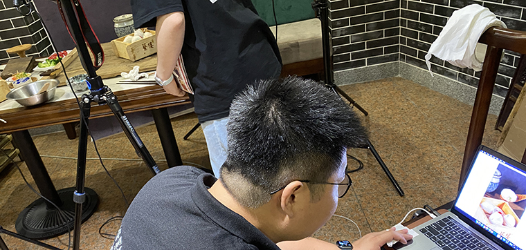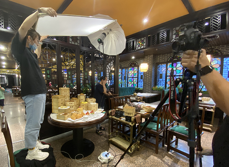 為達到理想拍攝效果,品深設計師再次來到蘩樓與廚師交流,了解這十款產品的特色,用料,制作工藝等細節,同時也購買有關廣式點心制作相關書籍進行對比學習,獲得很多新發現,如:判斷手工炸油條好壞,必須要展示其“絲瓜囊狀”橫切面。而蘩樓的油條比其他茶樓的都大,比一個正常成年人手臂還粗,賣點更多。