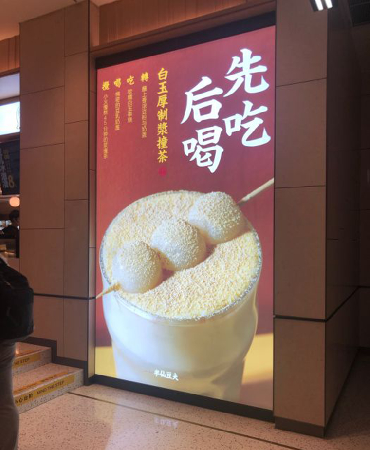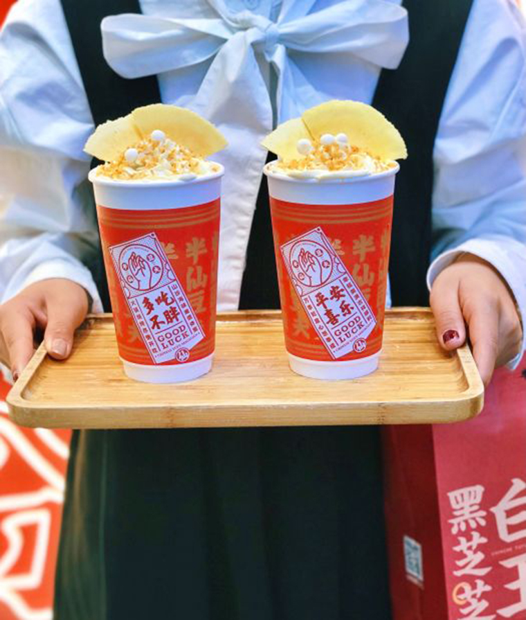 注重儀式感,豆?jié){出品前用一串日本白玉丸子橫在杯子上,并撒上豆粉,儀式感滿滿,白玉丸子蘸上香濃豆粉與奶蓋,先吃軟糯白玉串燒,再喝綿密的豆乳奶蓋,成功地把豆?jié){變成能吃的豆乳茶,引來顧客爭(zhēng)相拍照打卡,一時(shí)間成為網(wǎng)紅產(chǎn)品。