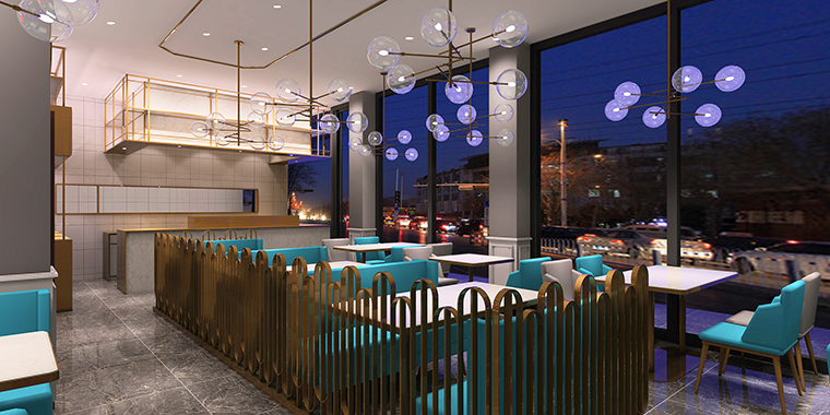 港灣茶餐廳內(nèi)部裝飾盡量簡潔為主,沒有繁復(fù)的線條,整裝護(hù)墻板采用高級(jí)灰,時(shí)尚感強(qiáng),藍(lán)綠色的招牌外觀,純鐵藝格柵,金色鍍銅架,整體氛圍休閑時(shí)尚,富有網(wǎng)紅特質(zhì)。