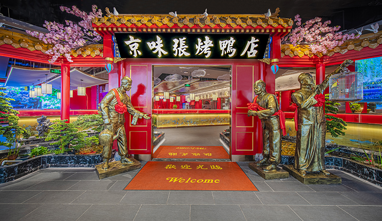 門口的迎賓人,提籠遛鳥人,跑堂人等雕塑銅人將老北京烤鴨飲食文化自然帶出;空間大量借鑒中式園林造景手法,點(diǎn)綴綠植,水景,框景,步移景異;